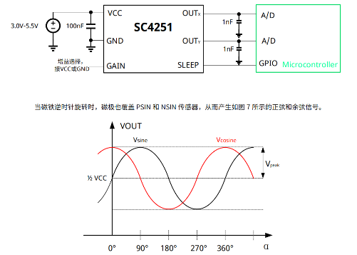 SC4251 是一款集成霍尔式位置传感器,用于扫描永磁体,当磁铁发生旋转,芯片输出正余弦模拟量输出,通过计算,得到永磁体当前位置。 SC4251拥有增益配置引脚,可通过外部电平高低,调整输出幅值。芯片支持休眠模式,在休眠模式,功耗为uA级,可应用于电池供电应用。